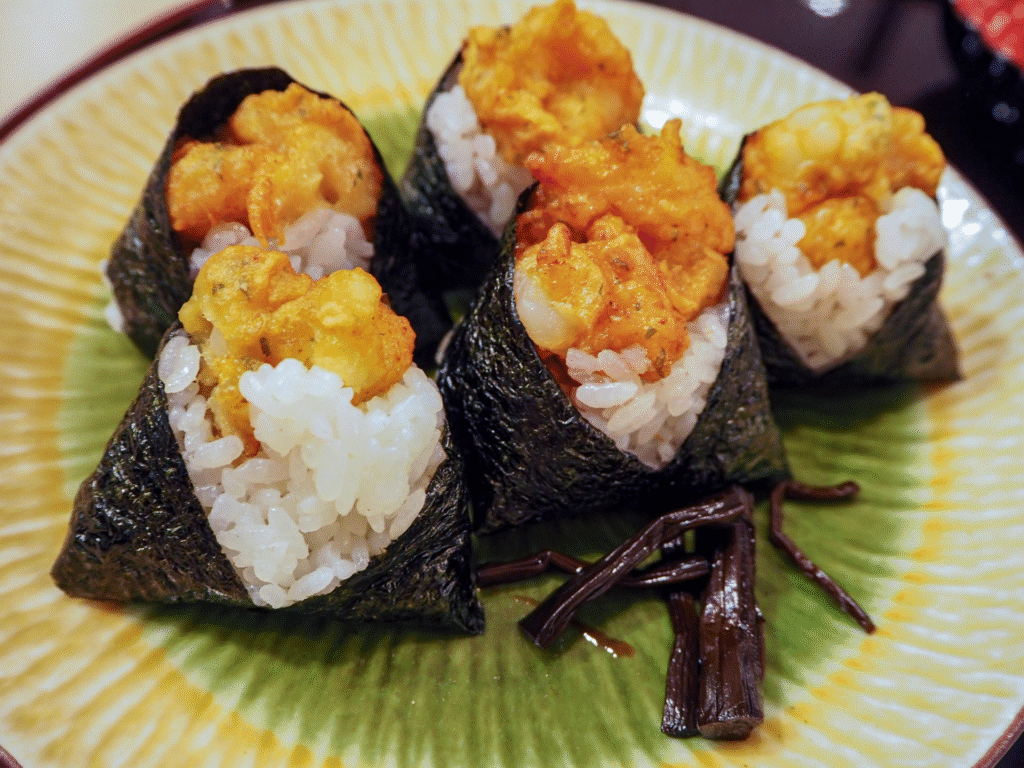 - 特徴: しっかりと味付けされた海老天が入った手のひらサイズのおにぎり。