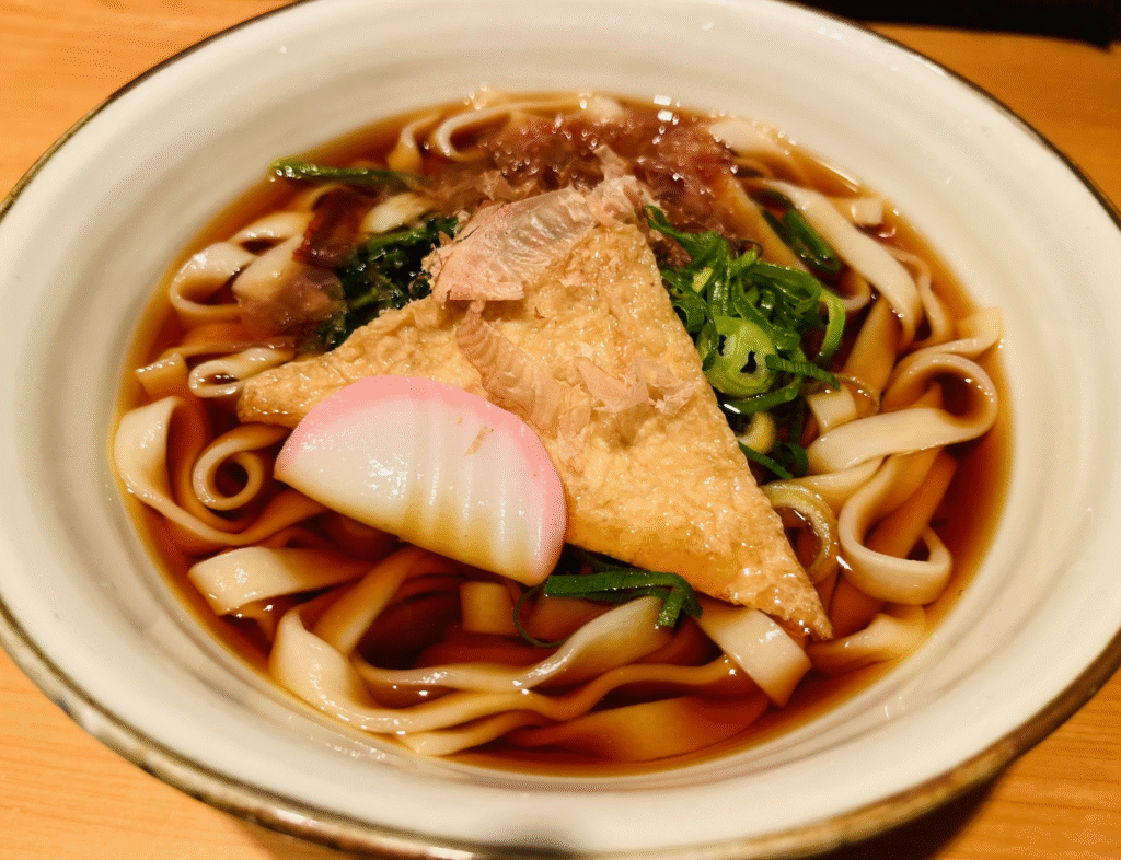 - 特徴: 平たく薄い麺が特徴のうどん。醤油ベースのだしでいただく。
